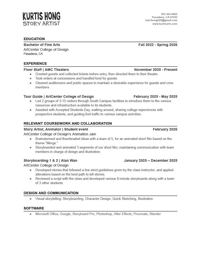 Hello! As you know, my name is Kurtis, and I am a ArtCenter student graduating in Spring of 2026. My job is to entertain, and Im willing to put in so much effort to learn to make my work even better.